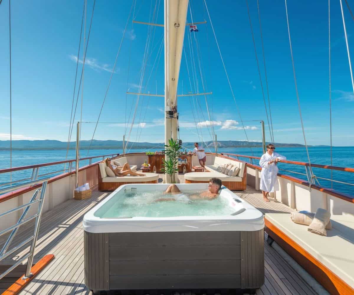 A deck jacuzzi adds a touch of glamour on board so you can sit back and relax with a cocktail while being soothed by the bubbling jets. But imagine stepping on board into a fully equipped beauty salon and spa with dedicated spaces for treatments and hair dressing plus a hammam or sauna. Sink into a relaxing massage while overlooking the ocean, prepare for a night out in style or even recover from the night before with a sauna and facial.